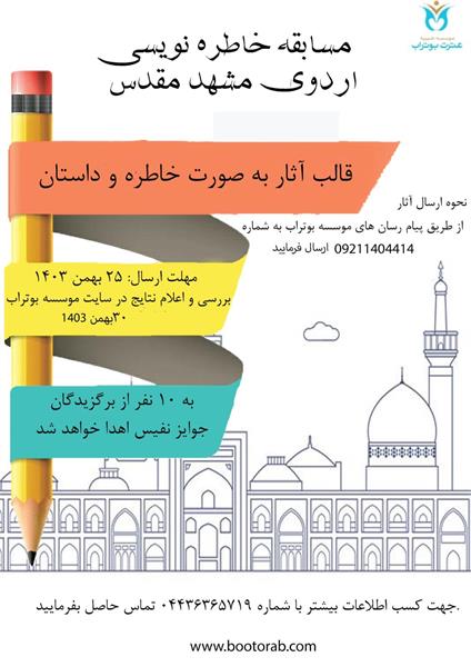 اخبار فراخوان مسابقه خاطرهنویسی اردوی مشهد مقدس به گزارش روابط عمومی خیریه عترت بوتراب، مؤسسه مسابقه خاطرهنویسی اردوی مشهد مقدس را برگزار میکند. علاقهمندان میتوانند آثار خود را در قالب داستان یا خاطره تا تاریخ ۲۵ بهمن ماه ۱۴۰۳ از طریق پیامرسانهای مؤسسه به شماره ۰۹۲۱۱۴۰۴۴۱۴ ارسال نمایند.نتایج مسابقه در تاریخ ۳۰ بهمن ماه از طریق وبسایت مؤسسه اعلام و به ۱۰ نفر از برگزیدگان جوایز نفیسی اهدا خواهد شد.جهت کسب اطلاعات بیشتر با شماره تلفن ۰۴۴۳۶۳۵۷۱۹ تماس حاصل فرمایید. ۱۵ بهمن ۱۴۰۳ ۱۹:۳۴ نظرات بینندگان میانگین امتیاز کاربران: 0.0 (0 رای) 12345 امتیاز 12345 برای امتیاز باید عدد وارد کنید نام را وارد کنید ایمیل صحیح نیست ایمیل نمایش داده شود. تعداد کاراکتر باقیمانده: 500 نظر خود را وارد کنید بازخوانی بازخوانی پس از انتشار این نظر، به من اطلاع داده شود. ارسال