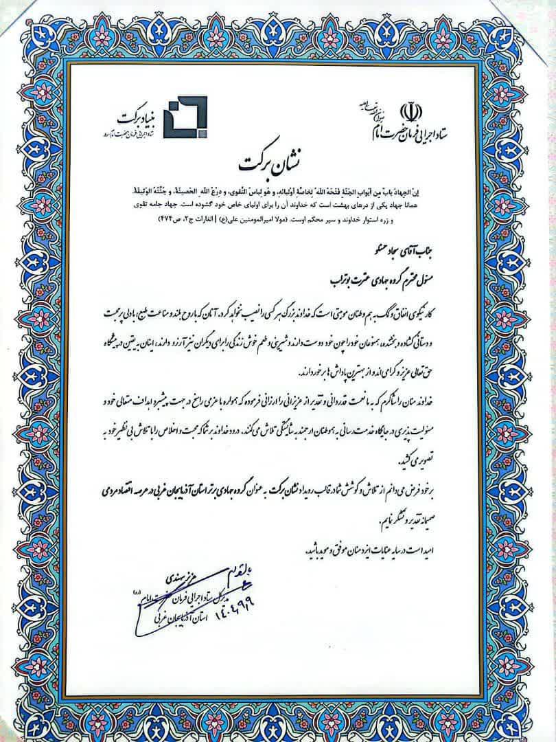 به گزارش روابط عمومی خیریه عترت بوتراب، در آئین نکوداشت گروههای جهادی و مردمی همکار بنیاد برکت، که به همت ستاد اجرایی فرمان امام(ره) و بنیاد برکت استان آذربایجان غربی برگزار شد، از «خیریه عترت بوتراب» به عنوان گروه برتر جهادی استان آذربایجان غربی در عرصه اقتصاد مردمی، تقدیر به عمل آمد. در این مراسم، به پاس نقش موثر خیریه عترت بوتراب در محرومیتزدایی و حمایت از ۲۵۰۰ نفر از ایتام استان آذربایجان غربی، نشان برتر برکت از بین ۱۰ خیریه برتر استان به خیریه عترت بوتراب اعطا شد.